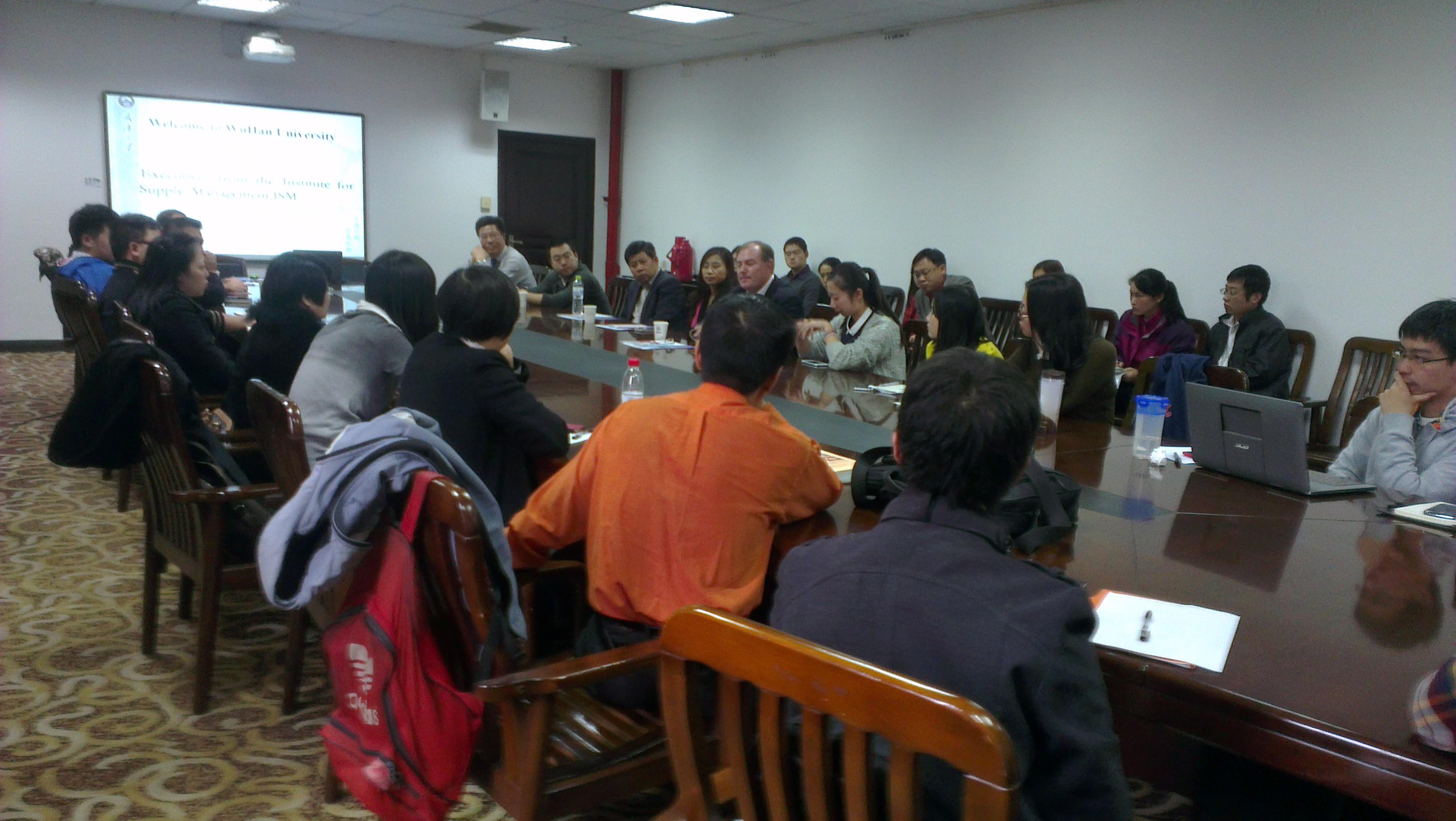 2014年11月8日下午,应管理科学与工程系、英国正版365官网产业制造与战略决策研究中心邀请,美国供应管理协会(ISM)首席执行官Mr. Thomason Derry、首席运营官Mr. Anthony Conant、资深副总裁Ms. Nora Neibergall及中国物流与联合采购会的相关专家来英国正版365官网作题为“美国供应链管理最新理论与最佳实践”的报告。英国正版365官网产业制造与战略决策研究中心主任、管理科学与工程系范如国教授主持了本次讲座,学院部分教师和研究生参加了该报告会。
