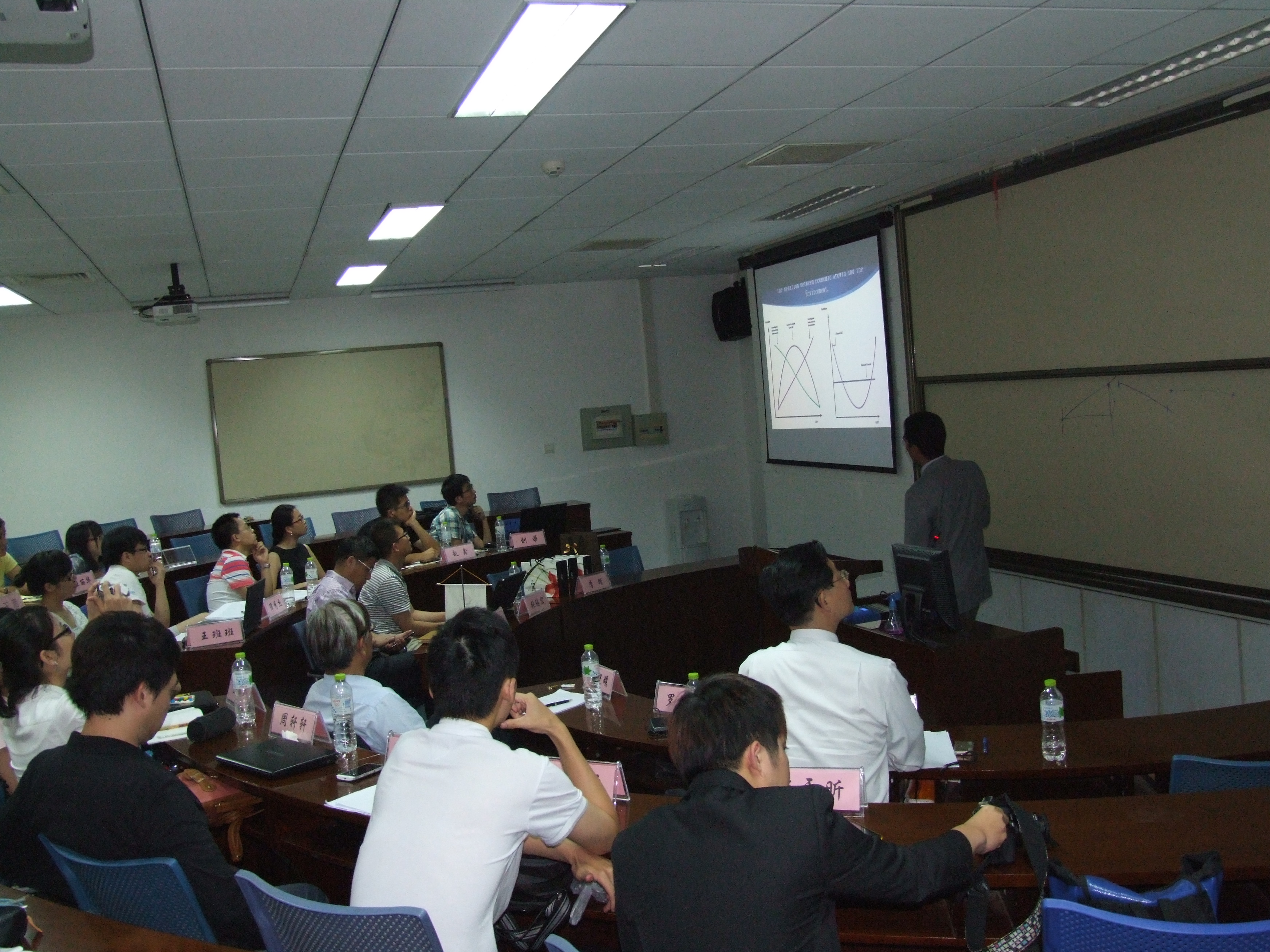 研究生交流会上,英国正版365官网博士生王班班和刘蒂分别以“有偏技术进步对碳减排强度的影响”和“不同来源地的FDI对我国碳排放影响的实证研究”进行了演讲;台北大学博士生罗艾凡和硕士生周轩轩则分别就“动态经济增长:拉美和东亚的EKC曲线对比分析”,以及“台湾绿色成长指标建置之研究-以修正型层级分析法为例”为主题展开演讲。