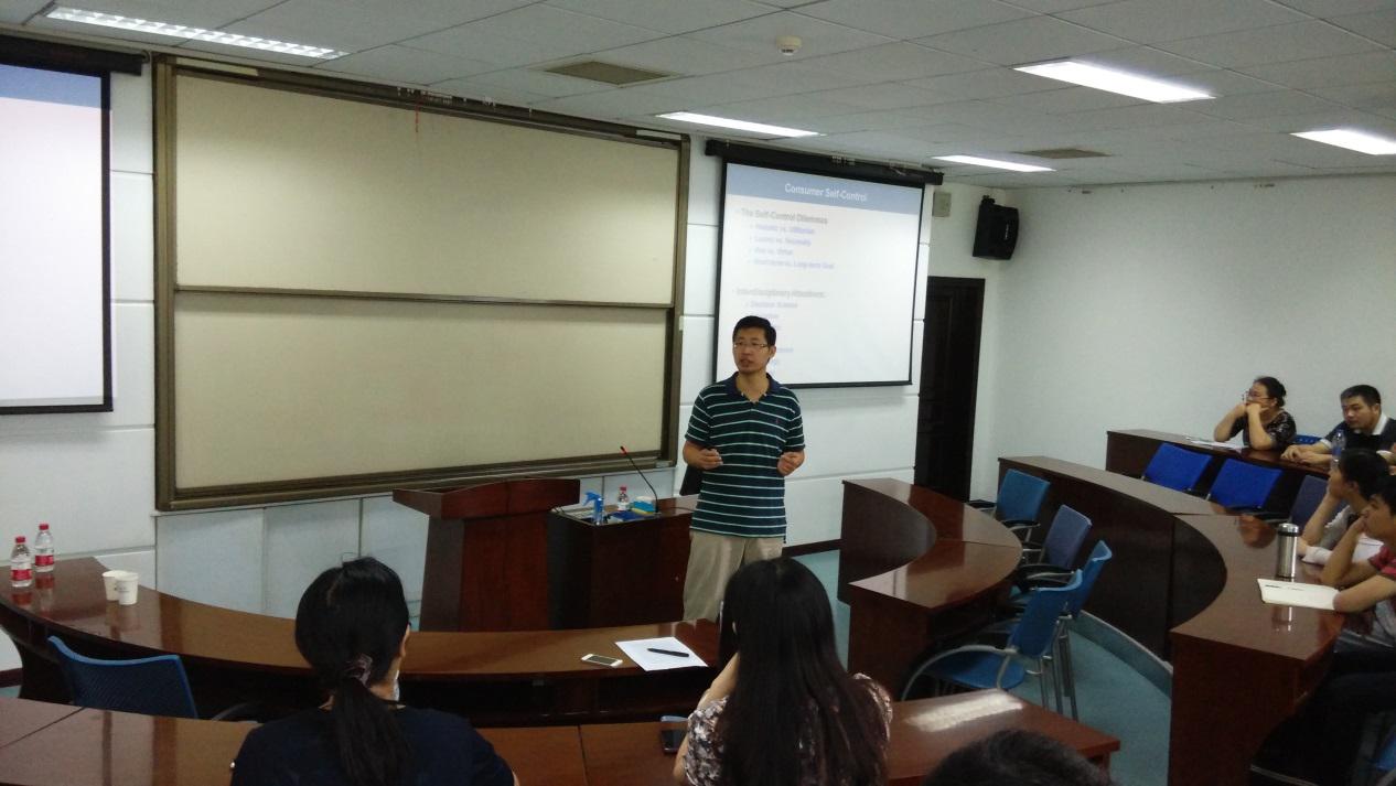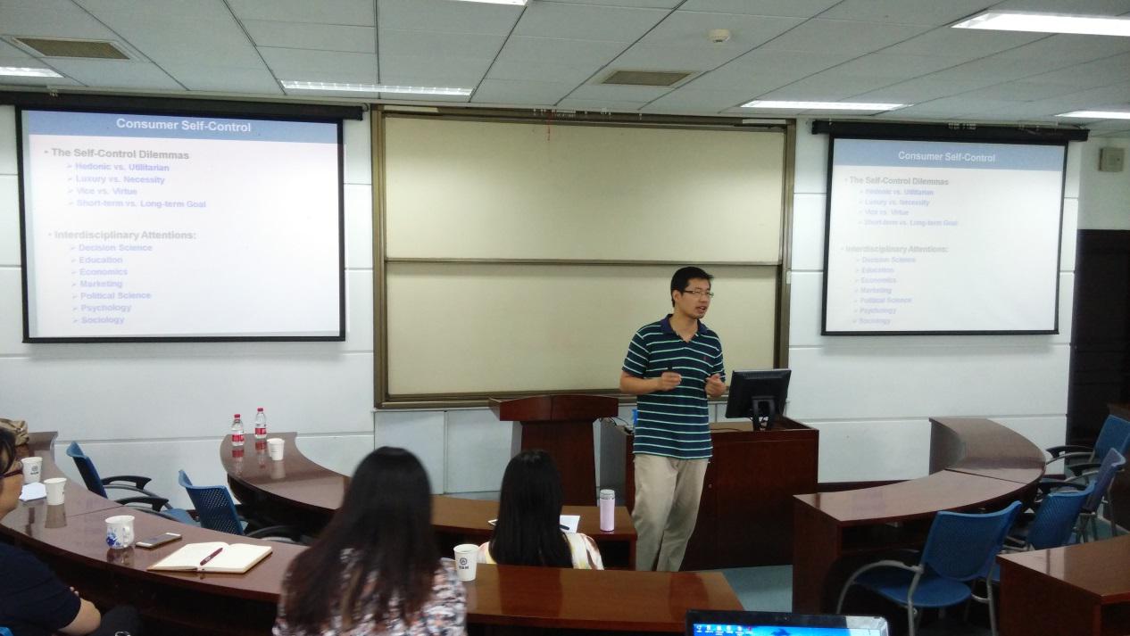 在上午的报告展示中,郑教授首先就生活中享乐品与实用品,即时小奖励与延迟大奖励选择等消费者两难情境出发,引出自我控制的问题。然后介绍了他有关消费者自我控制的四个具体研究内容。第一个研究区别于以往学者关注自我控制对消费者的负面影响,郑教授关注消费者在什么情况下会放松自我控制。实验结果表明很多人是过度自我控制的,放松自我控制需要理由来降低愧疚感(guilt):努力,个体感知优秀程度,金钱。第二个研究关注金钱与消费者的自我控制,金钱真的是万恶之源吗?郑教授运用调节聚焦理论(Theory of Regulatory Focus)解释人们在有钱的情况下会产生规避导向(prevention focus),继而提高了自我控制。第三个研究则介绍了性感刺激对男性自我控制的影响,即性感刺激能够在持久力,任务表现上,认知上提高男性的自我控制。最后一个研究结合营销实践,讨论了产品的排列组合如何影响消费者的自我控制。巧妙的实验设计和有趣的生活及营销实例赢得阵阵掌声,各位老师和同学受益匪浅。
